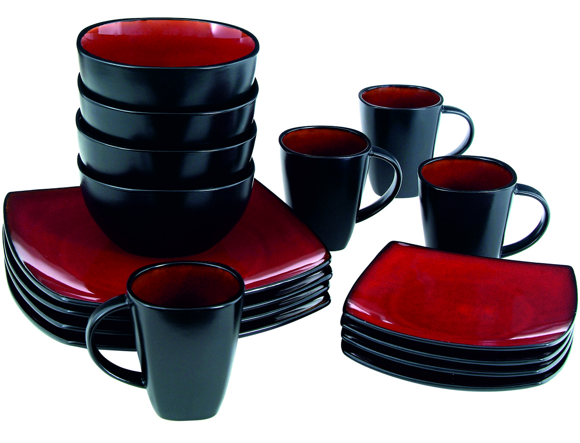 - 16-Piece Dinnerware Set – Stoneware is hip, cool and trendy. Especially in a fashionable red and black. This 2-tone glazed dinnerware set makes a statement at the table.