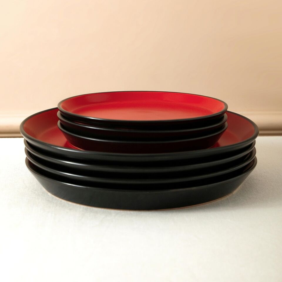 Make a loud statement with your two-tone glazed dishes. The Stone Lain 16-Piece Stoneware Round Dinnerware set in Red and Black is unforgettable. The perfect balance between trendy cool and modern classicism, these round plates, bowls and cups turn every table into a hip party. It includes 4 large round 10” dinner plates, 4 round 7. 5” salad plates with a unique lipped edge, 4 deep round 5. 75” bowls and 4 earthy 12 oz cups. These home essentials are expertly crafted, artfully designed and reminiscent of after parties. 100% dishwasher and microwave safe for easy cleaning and durability. These pieces go great in a kitchen, dining or outdoor setting. Lay out your most stylish tablecloth, cutlery and stemware, and let the Stone Lain 16-piece stoneware dishes do the rest. Stone Lain creates unforgettable dinnerware to make every occasion memorable. Thank you for choosing Stone Lain, where dishes come true.