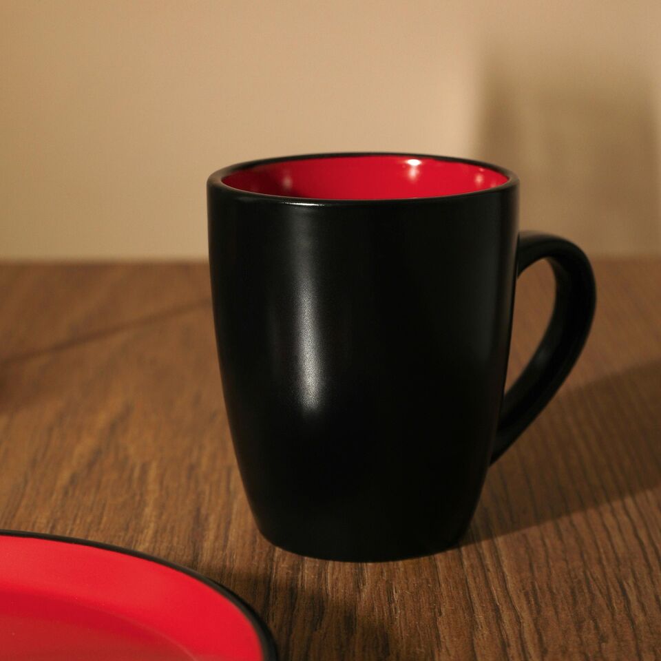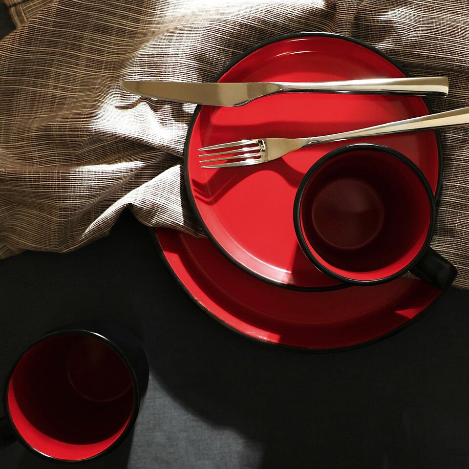 - Matte Red and Black Plates, Bowls, Mugs – 10” dinner plates, 7. 5” salad plates, 5. 75” bowls and 12 oz. mugs have a cool, hip, colorful design.