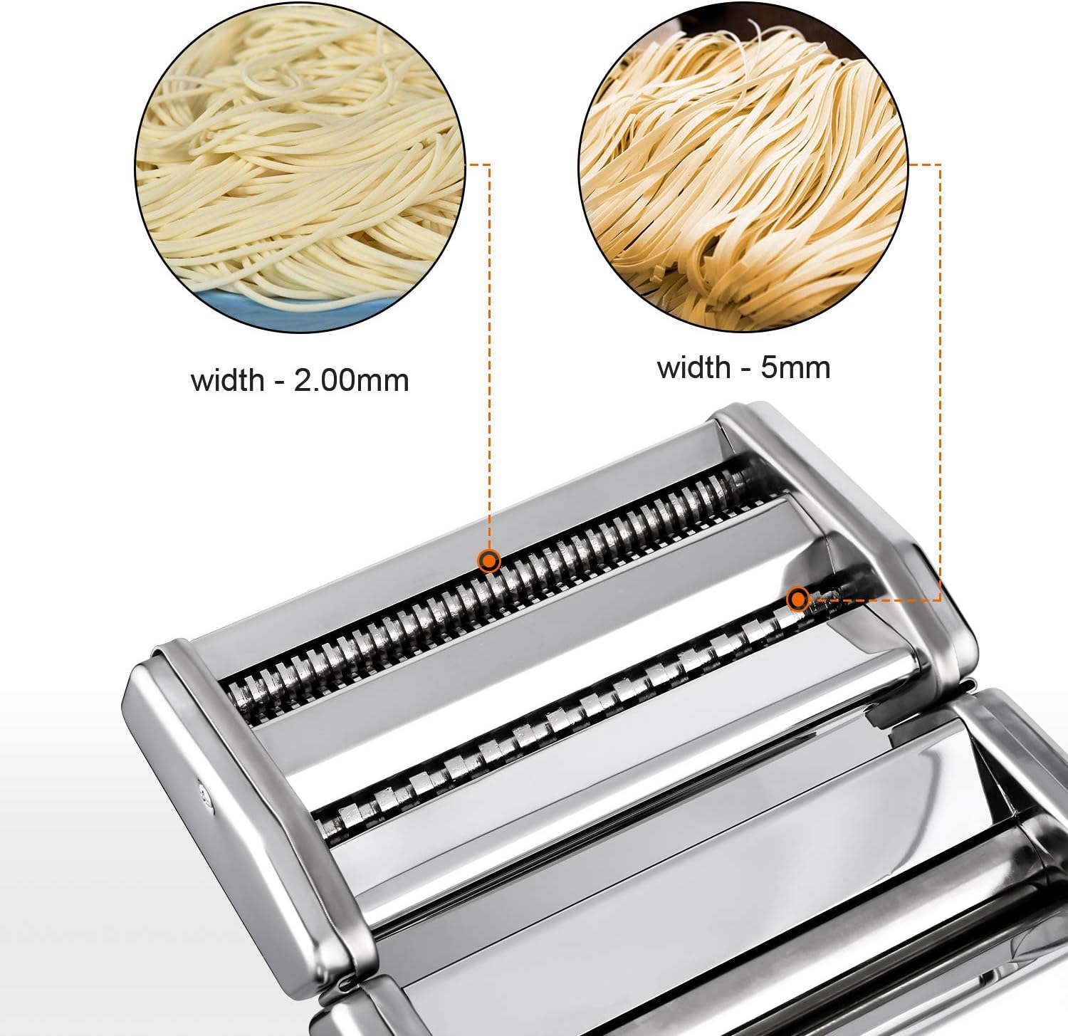 - ✔ Width and thickness adjustment: adjustable pasta machine comes with 2 stainless steel cutting blades: 2.0 mm (vermicelli)/4.5 mm (fettuccine) and 7 different thicknesses for kneading, there is more choice to make your delicious food!