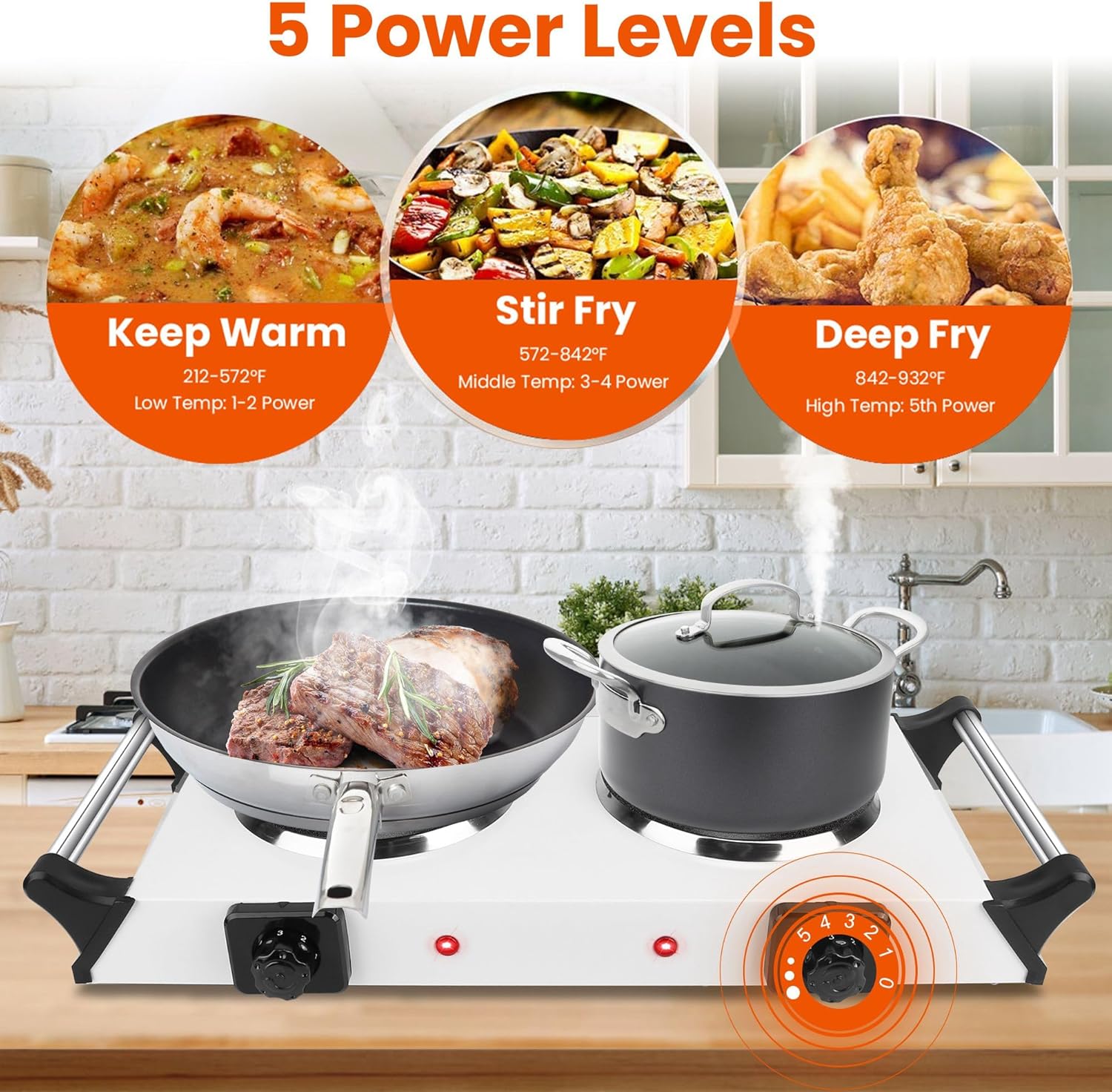 - **🌡️ 5 Precise Temperature Levels:** Choose from 5 adjustable heat settings (392°F to 932°F) to meet all your cooking needs—whether boiling water, frying steak, simmering soups, or grilling vegetables. Independent thermostat controls and indicator lights make operation intuitive and hassle-free.